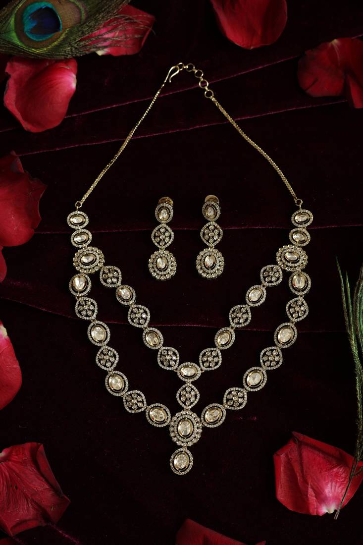 • Product Id : 4696496 • Package Details : 1 Necklace 1 Pair Of Earrings • Type : Necklace Sets • Look : Contemporary • Jewellery Work : American Diamonds • Color : White • Plating : Antique Gold • Base Material : Brass Payments [+]