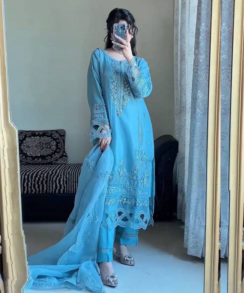 • Product Id : 4716435 • Package Details : 1 Top : 1 Bottom : 1 Dupatta • Type : Readymade Suits For Women • Occasion : Ceremonial • Work : Embroidered • Look : Designer • Sleeve : Full Sleeve • Neck Style : Round Neck • Fabric : Georgette • Color : Blue • Stitching : Stitched Payments [+]