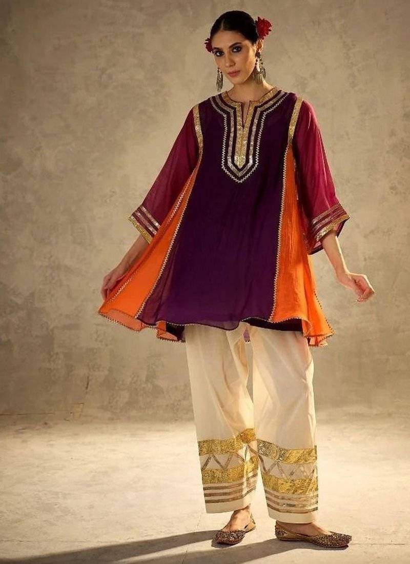Purple & Orange Flared Kurta With Gold Trim Palazzo Stitched