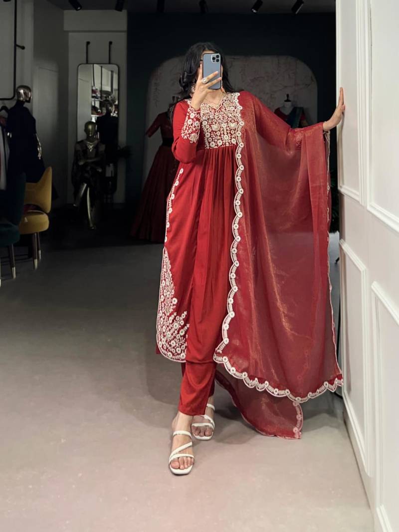 If you find the product for less we'll match it! Know MoreStep into timeless elegance with this red Anarkali-style kurta set designed with a graceful flare and intricate sleeve embroidery. Crafted for comfort and style, it includes matching bottoms and an embroidered dupatta. Perfect for weddings, festive events, and traditional celebrations, offering a regal and sophistic