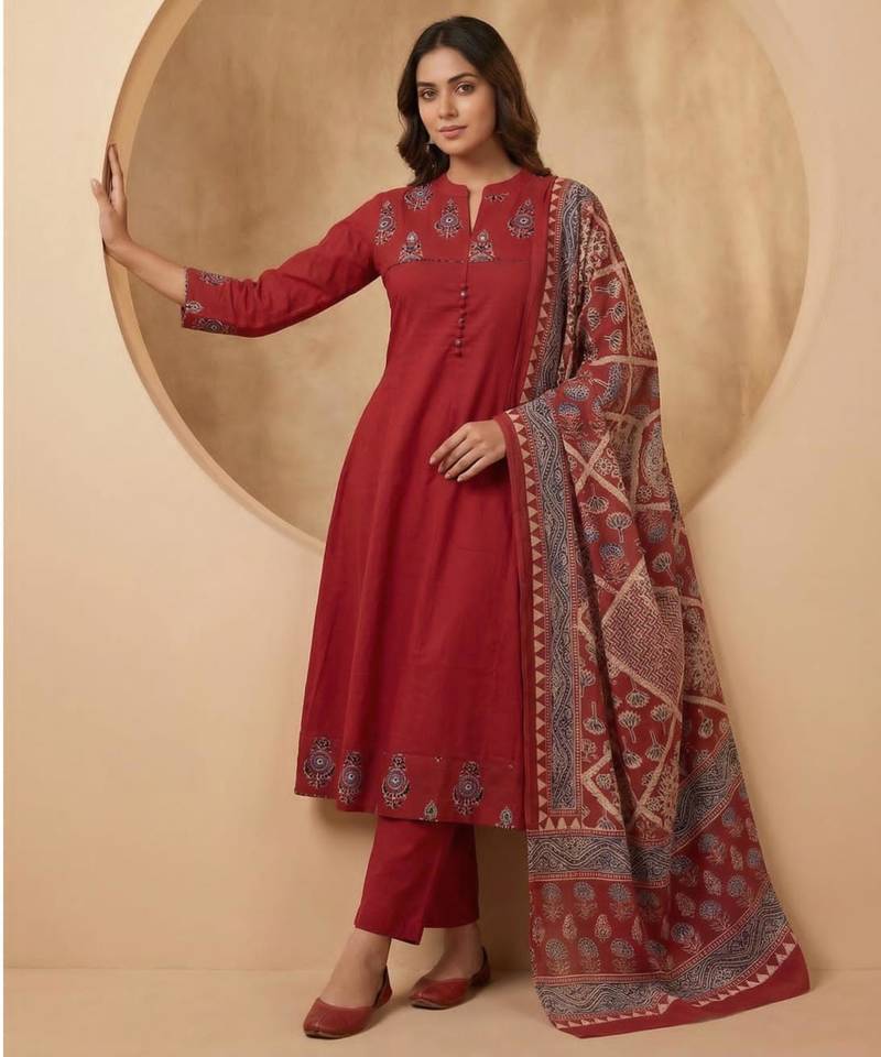 Experience timeless elegance in this deep crimson A-line kurta. The design features a sleek Mandarin collar with button detailing and subtle shoulder embroidery. Paired with a rich, geometric Kalamkari-inspired dupatta, this set represents a sophisticated take on classic ethnic wear, perfect for the woman who appreciates structured silhouettes and heritage prints.