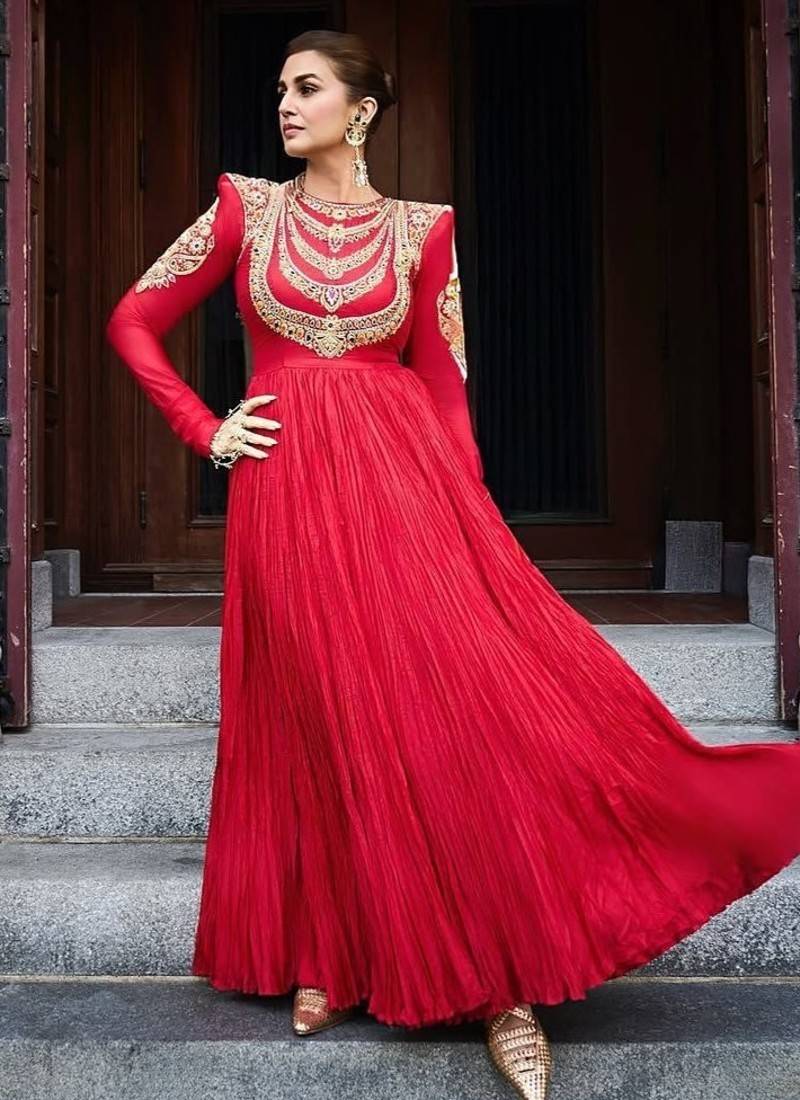 A stunning red floor-length gown with heavy gold embroidered neckline and shoulder detailing. The pleated flare adds dramatic elegance, making it perfect for receptions, cocktail parties, and grand wedding celebrations. A true showstopper outfit.