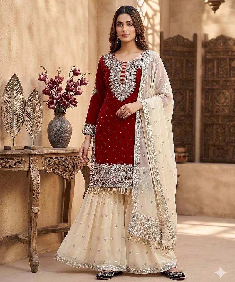 Elevate your festive wardrobe with this luxurious maroon velvet kurta featuring intricate silver zari embroidery. Paired with a flowy cream georgette sharara and a matching scalloped dupatta, this ensemble offers a sophisticated regal look. Perfect for winter weddings and evening celebrations where traditional grace meets modern style