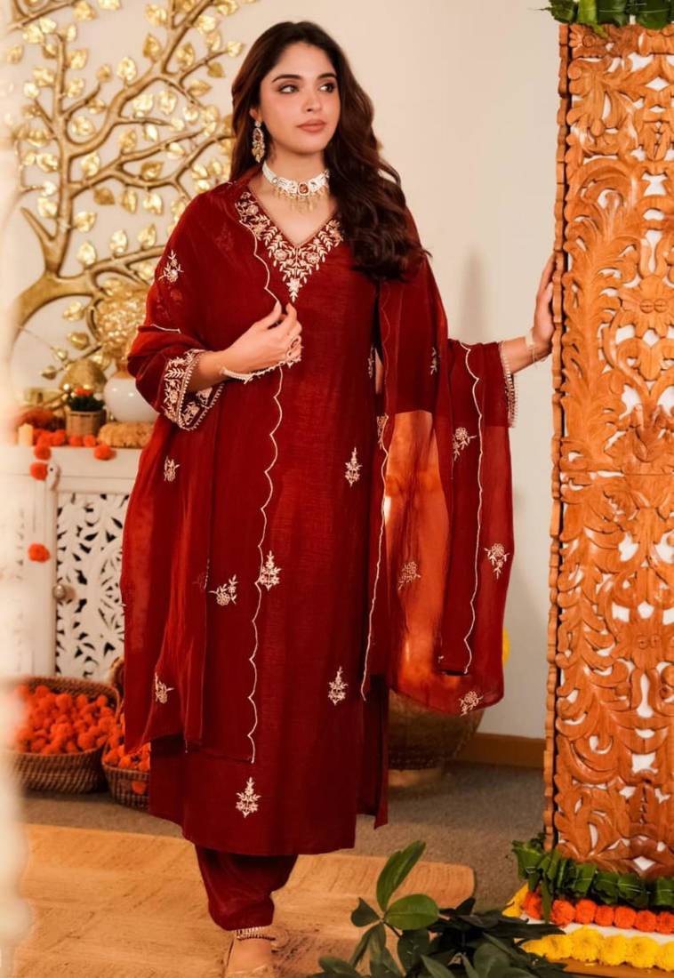 • Product Id : 4739659 • Package Details : 1 Top : 1 Bottom : 1 Duppata • Type : Kurta Sets • Occasion : Casual • Work : Embroidered • Type : Thread Work • Look : Contemporary • Sleeve : Quarter Sleeve • Neck Style : V Neck • Color : Red • Fabric : Silk Blend • Stitching : Stitched • Length : 44.0 • Side Slit : Yes General - Color and Texture may have slight variation. This happens because of photography.