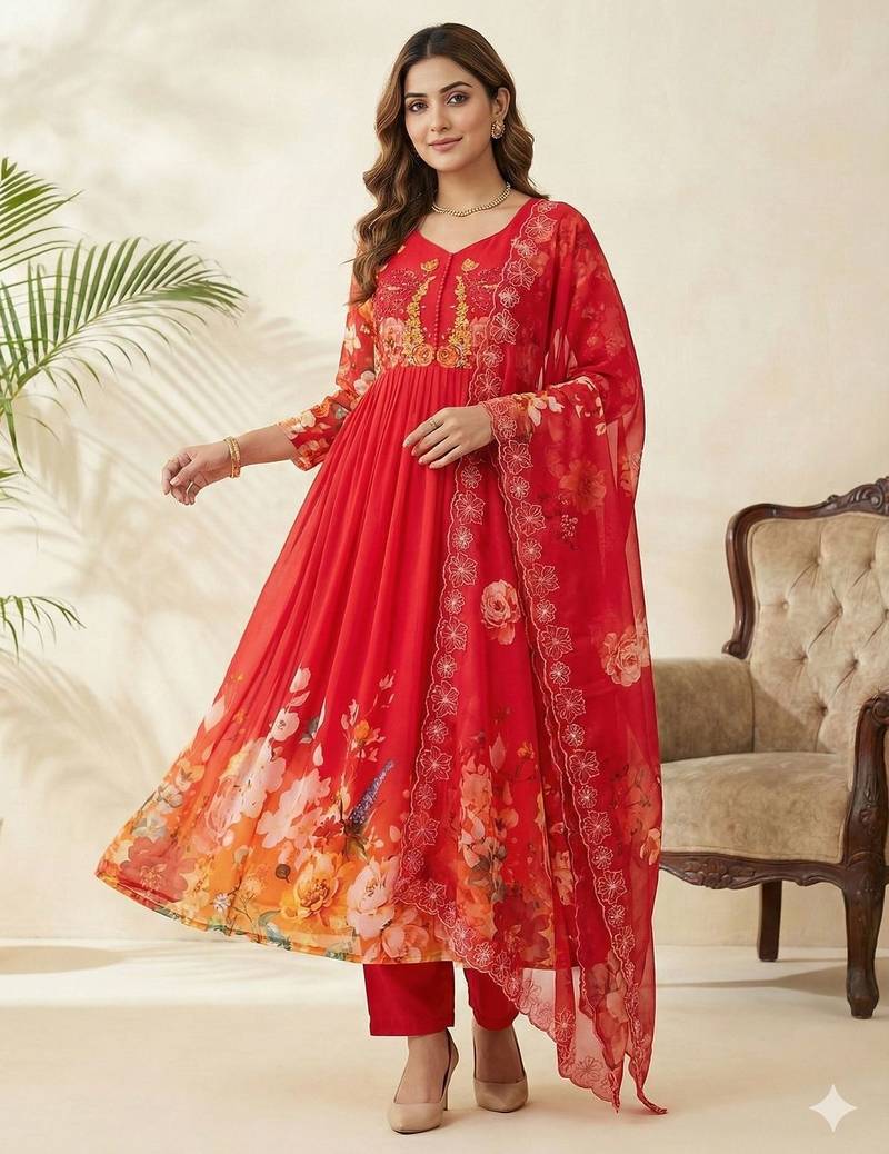 Twirl in style with this floor-length red Anarkali suit. Made from lightweight georgette, the dress features a stunning floral print and a meticulously embroidered yoke with button detailing. Accompanied by solid trousers and a matching floral dupatta, this feminine ensemble offers effortless grace and comfort for summer weddings or evening soirées.