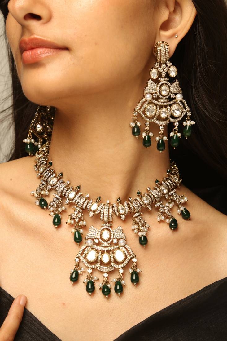 Turn heads with this luxurious statement necklace set featuring dazzling crystals, pearl accents, and rich emerald-green bead drops. The intricate craftsmanship highlights a dramatic central pendant, paired with ornate matching earrings. Perfect for bridal wear, receptions, and grand celebrations, bringing timeless glamour to any outfit.