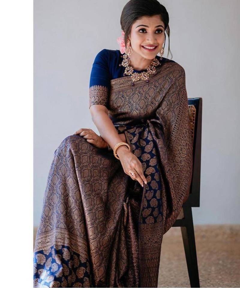 Make a bold statement in this majestic navy blue silk blend saree. The entire drape is adorned with dense, bronze-toned intricate weaving, creating a vintage tapestry effect. Paired with a matching navy blouse, this heavy-weight traditional garment is perfect for grand weddings, evening receptions, and high-end festive events.