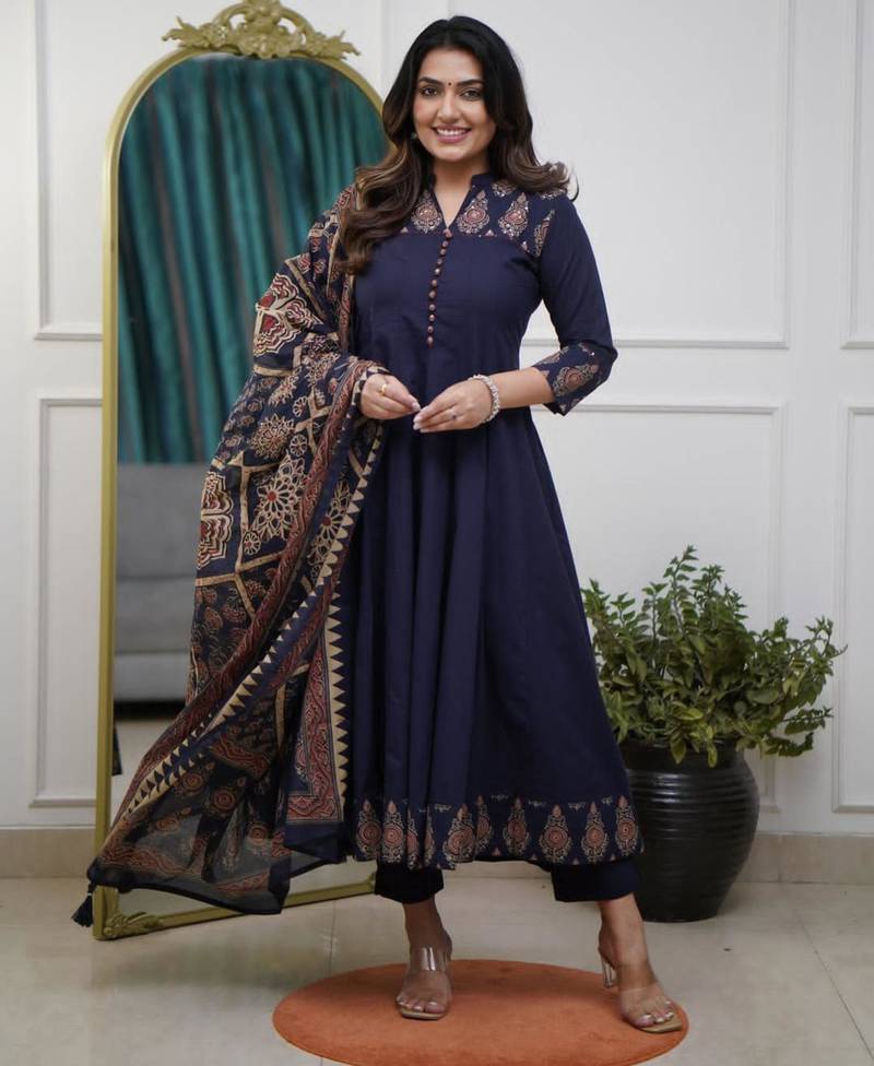 Elevate your festive attire with this royal navy flared kurta. The silhouette is enhanced by a dramatic gold-tone medallion border at the hem and coordinating sleeve accents. Featuring a button-down bodice and a lightweight dupatta with intricate borders, this ensemble offers a majestic presence and superior comfort for any special occasion.