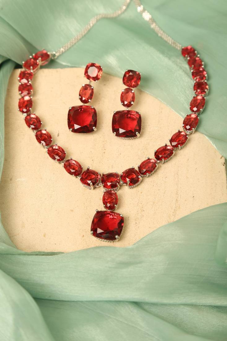 Adorn yourself with this exquisite ruby-red necklace and earring set. Featuring vibrant, cushion-cut synthetic rubies meticulously linked in a sleek silver-tone setting, this ensemble offers a sophisticated pop of color. Perfect for gala events or festive celebrations, it blends contemporary minimalism with timeless glamour for a truly radiant look.