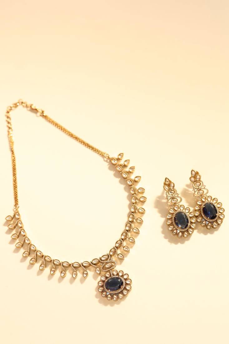 • Product Id : 4718251 • Package Details : 1 Necklace 1 Pair Of Earrings • Type : Necklace Sets • Occasion : Ceremonial • Look : Contemporary • Jewellery Work : American Diamonds • Color : Blue • Plating : Antique Gold • Base Material : Alloy Payments [+]