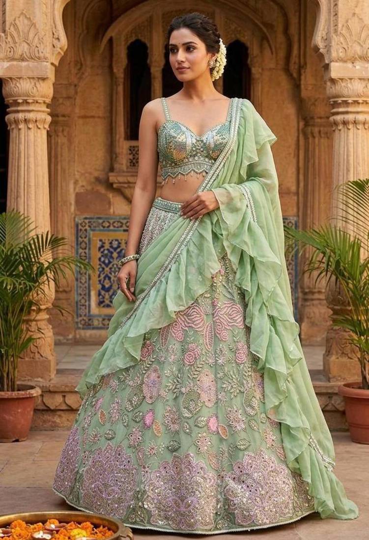 If you find the product for less we'll match it! Know MoreStep into a floral fantasy with this mint green lehenga choli. Meticulously crafted with lavender and pink floral embroidery, the ensemble is highlighted by a scalloped-edge sweetheart blouse. Paired with a lightweight ruffled net dupatta, this airy ensemble is ideal for spring garden weddings and high-end pre-wedding rituals.