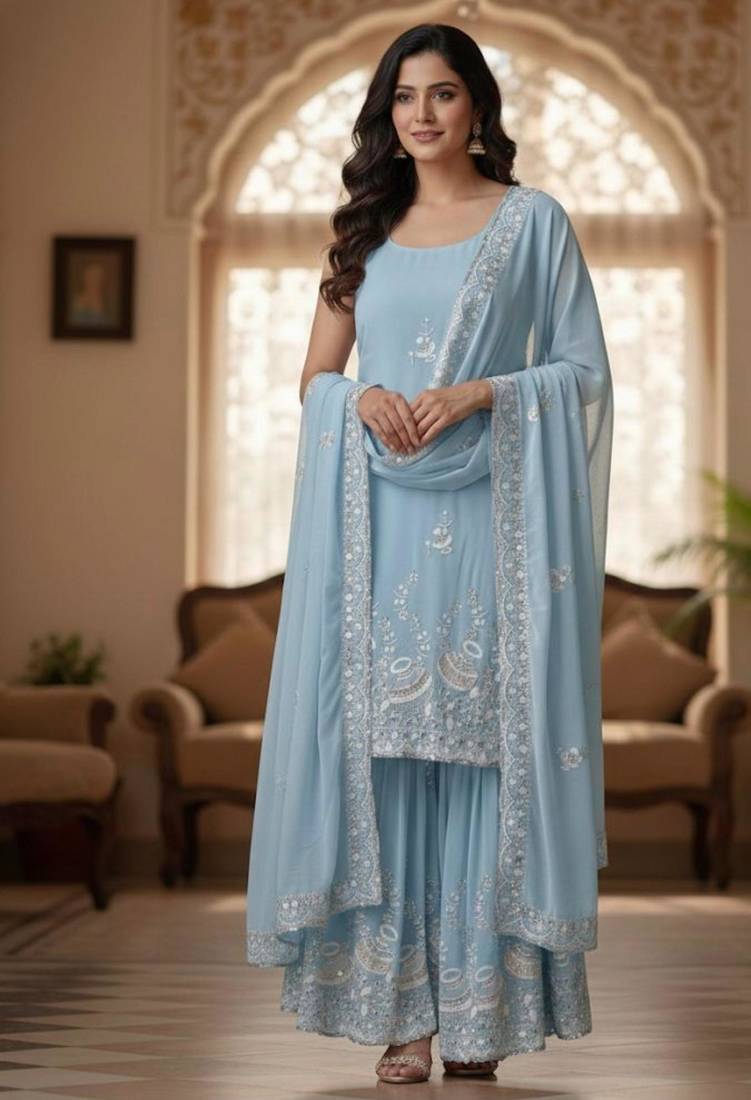 This vibrant sky blue sharara set blends traditional craftsmanship with contemporary elegance. Featuring elaborate silver-tone threadwork and mirror-style embellishments across the hemline and dupatta, this ensemble offers a striking visual appeal. The lightweight georgette fabric ensures a graceful drape, making it an exceptional choice for evening soirées and formal cultural events.