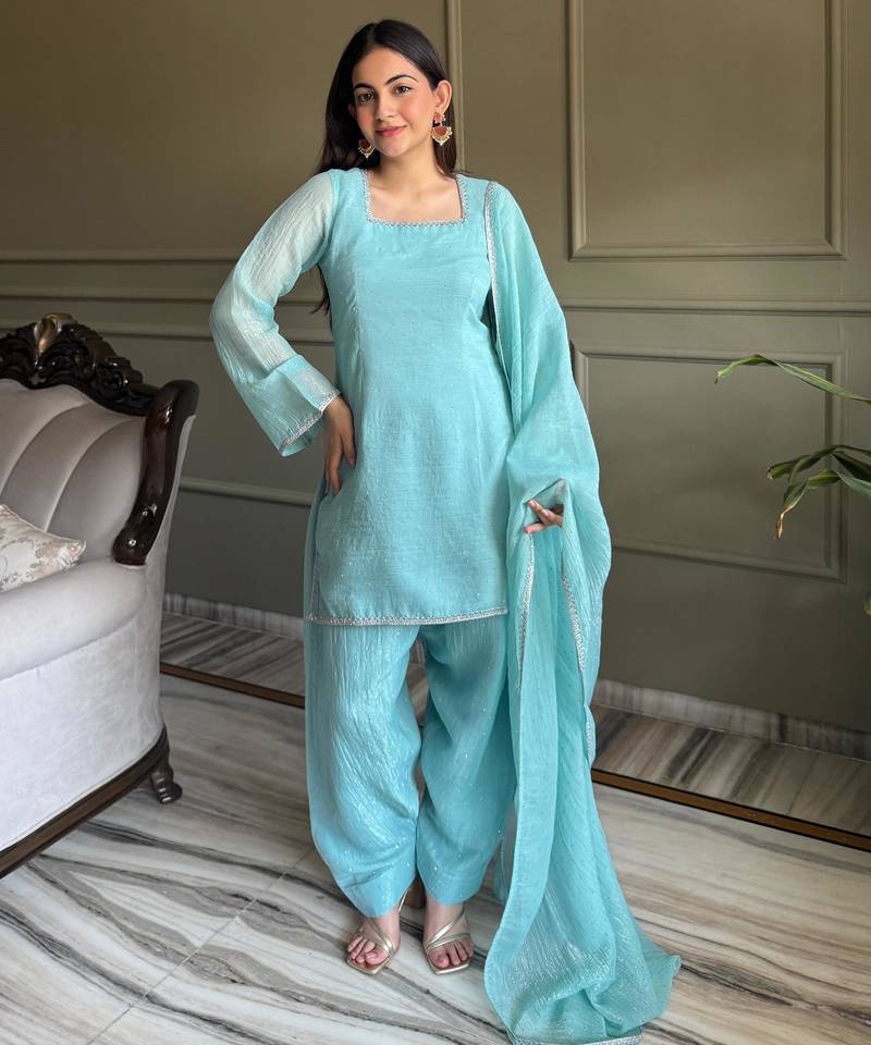 Embrace a fresh, breezy look with this sky blue shimmer suit. The set features a minimalist straight-cut kurta with a chic square neckline and silver lace trim. Paired with voluminous Patiala-style salwars and a matching lightweight dupatta, this ensemble offers a perfect blend of traditional Punjabi silhouettes and contemporary pastel aesthetics.