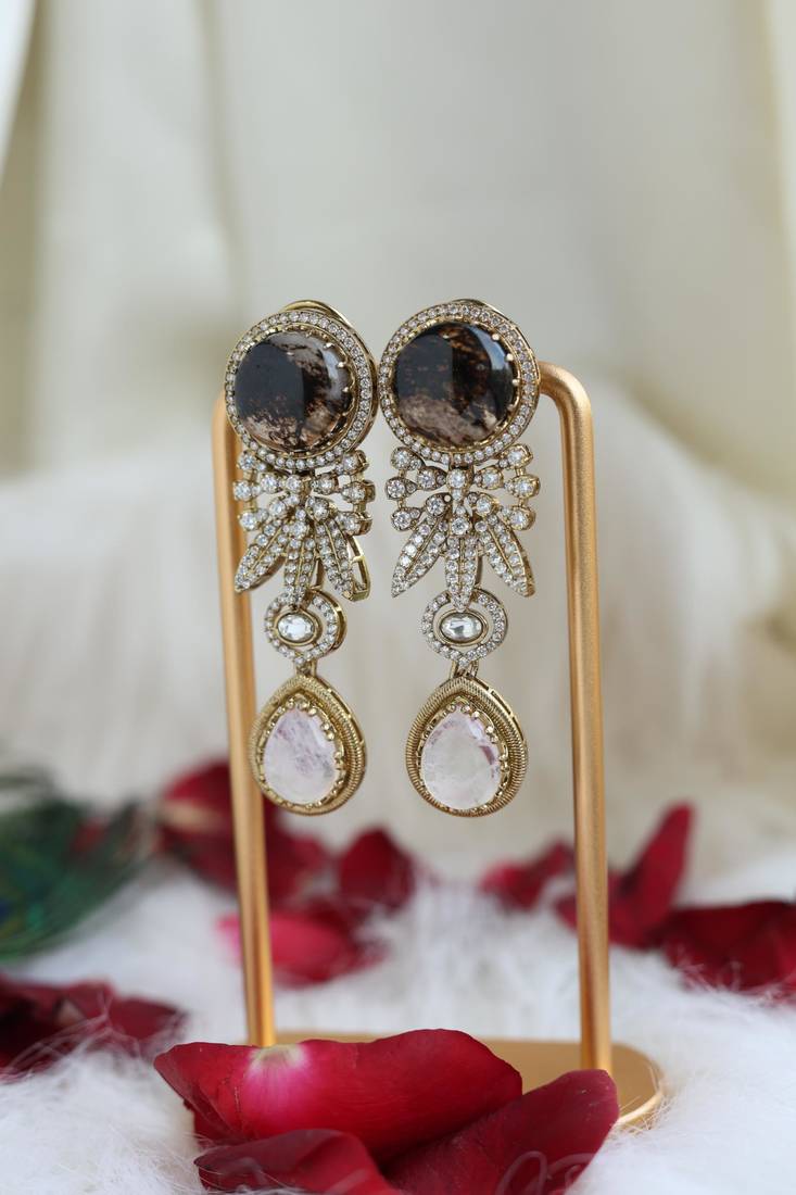 • Product Id : 4696511 • Package Details : 1 Pair Of Earrings • Type : Earrings • Occasion : Ceremonial • Look : Contemporary • Jewellery Work : American Diamonds • Color : Black • Plating : Antique Gold • Base Material : Brass Payments [+]