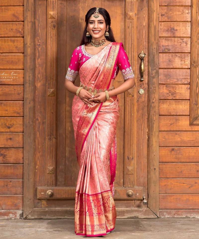 Radiate feminine grace in this gorgeous soft rose pink silk blend saree. The magnificent drape is spectacularly highlighted by a bold, heavily woven magenta pink zari border, creating a visually dynamic contrast. A quintessential choice for modern bridal parties and luxurious festive gatherings, it ensures a flawlessly elegant silhouette.