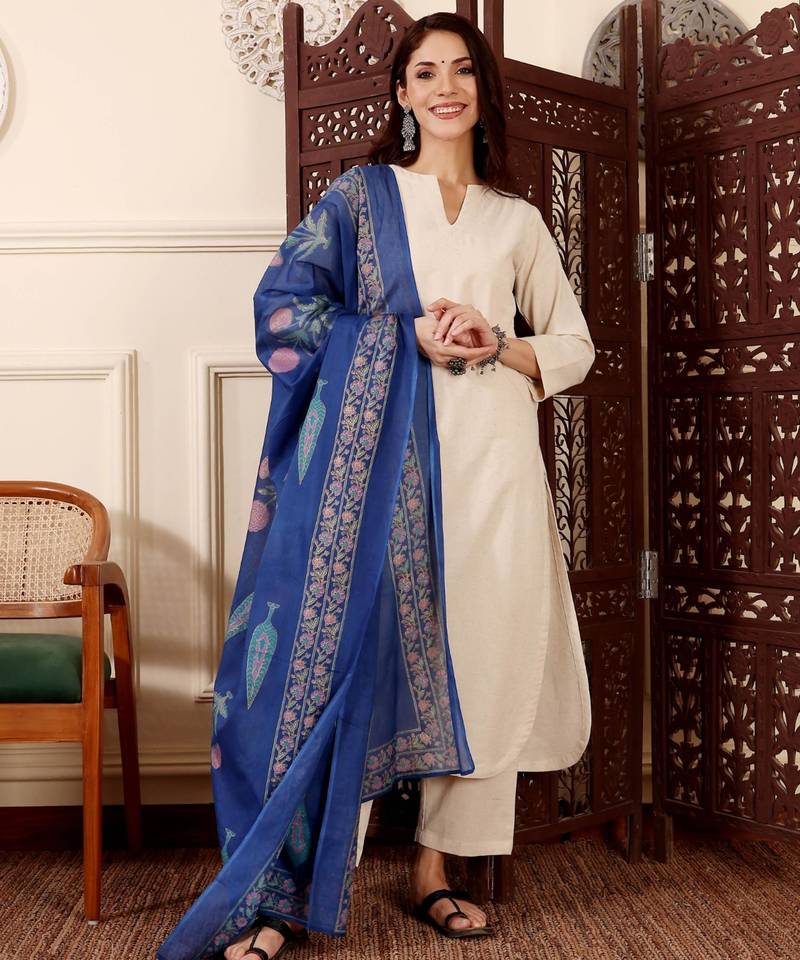 If you find the product for less we'll match it! Know MoreEmbrace minimalist luxury with this white straight-cut kurta set. Crafted from breathable cotton-linen, the understated cream tunic and trousers provide a clean canvas for the show-stopping cobalt blue dupatta. Featuring artisanal floral prints and a wide border, this versatile ensemble offers a refined, polished look for both office and social events.