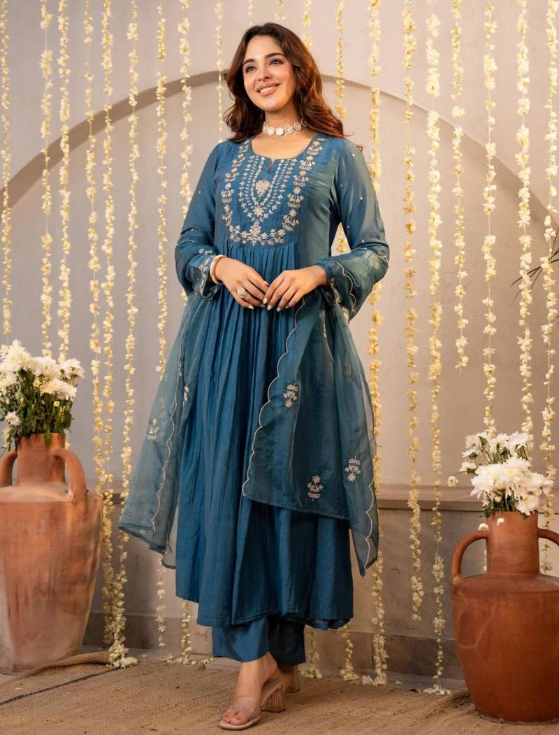 If you find the product for less we'll match it! Know MoreElevate your festive wardrobe with this breathtaking teal blue Anarkali set. The ensemble features an intricately embroidered yoke and delicate pleated detailing for a royal silhouette. Complete with matching trousers and a sheer, scalloped-edge organza dupatta, this high-quality suit offers a perfect blend of traditional craftsmanship and modern elegance.