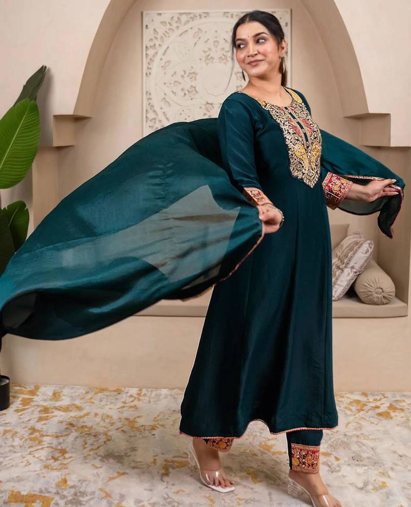 • Product Id : 4739655 • Package Details : 1 Top : 1 Bottom : 1 Duppata • Type : Kurta Sets • Occasion : Casual • Work : Embroidered • Type : Thread Work • Look : Contemporary • Sleeve : Quarter Sleeve • Neck Style : Round Neck • Fabric : Silk Blend • Color : Teal Green • Stitching : Stitched • Length : 48.0 • Side Slit : Yes Payments [+]