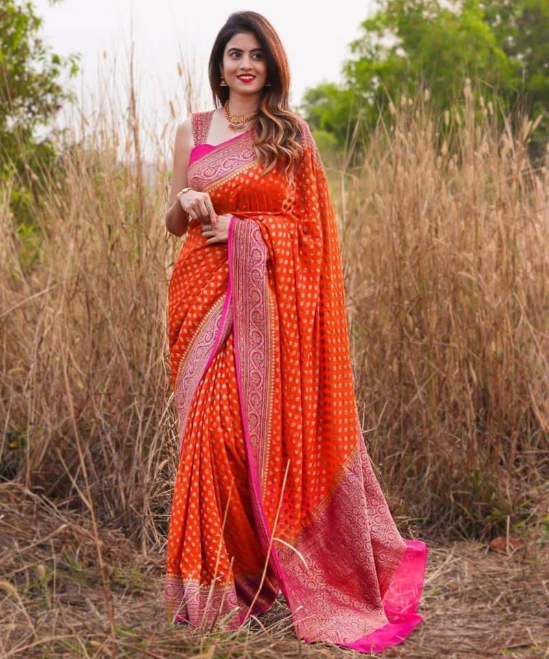 Embrace traditional charm with this bright orange silk blend saree featuring classic Bandhani-inspired motifs. The contrasting deep pink border is enriched with ornate metallic weaving, offering a playful yet elegant aesthetic. It is the perfect ensemble for festive gatherings where you want to showcase a vibrant, cultural flair.