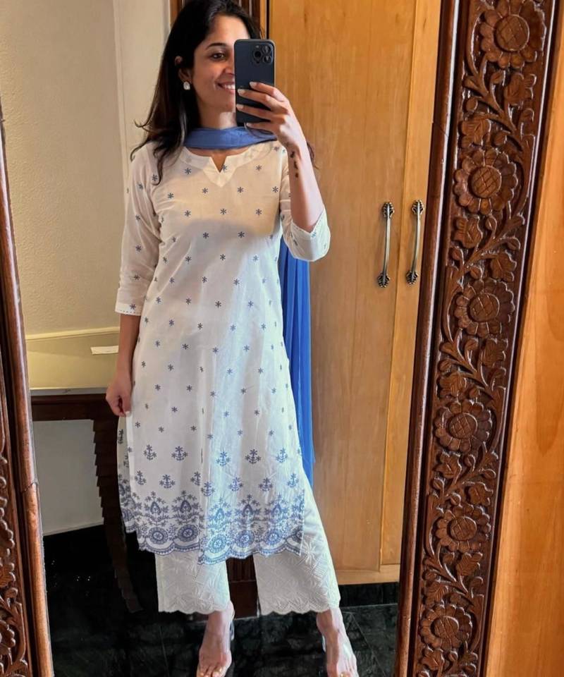 Refresh your wardrobe with this elegant white kurta set featuring delicate blue floral prints and a beautifully detailed hemline. Crafted from breathable cotton, it ensures all-day comfort. Paired with matching pants and a soft blue dupatta, this outfit is perfect for casual outings, office wear, or summer gatherings.
