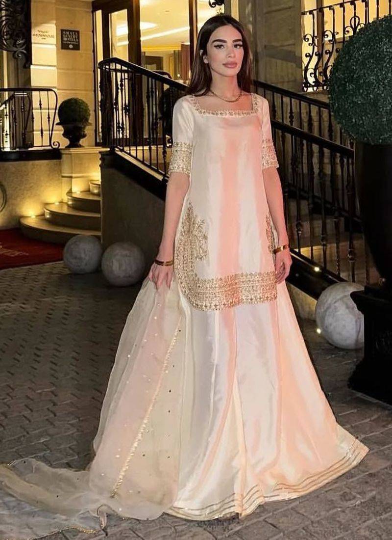 If you find the product for less we'll match it! Know MoreShine in sophistication with our white silk blend sharara suit. This high-fashion ensemble features a short-sleeved tunic adorned with delicate gold embroidery on the sleeves and hem. Paired with voluminous flared pants and a lightweight dupatta, it offers a luxurious, editorial-inspired look perfect for evening soirées and upscale traditional events.