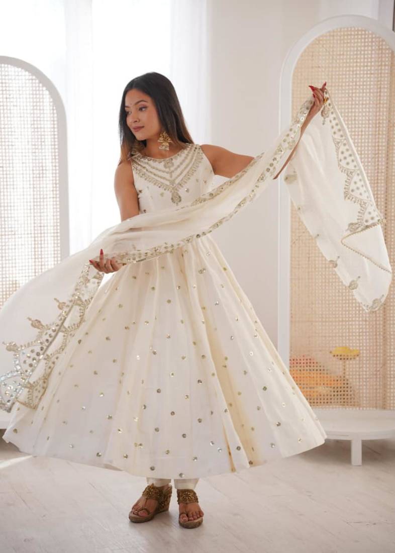 If you find the product for less we'll match it! Know MoreExude serenity in this white Anarkali suit. The minimalist design is highlighted by an ornate gold embroidered yoke and delicate sequin clusters. Paired with a matching dupatta and trousers, this high-quality silk blend ensemble is a sophisticated choice for daytime weddings, religious ceremonies, or summer festivities.