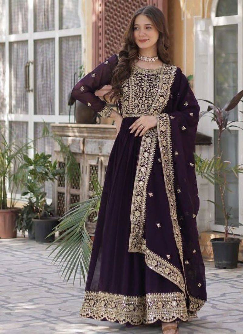 Exude royal elegance in this breathtaking deep purple Anarkali suit. Made from high-quality flowy georgette, this floor-length gown features a heavily embroidered yoke and delicate floral motifs throughout the sleeves. The hemline is adorned with a rich, scalloped gold border that adds a luxurious weight to the silhouette. Accompanied by a coordinating embroidered dupatta, this outfit is a must-have for wedding receptions and formal evening galas. The deep plum hue combined with artisanal threadwork creates a flattering, regal aesthetic that promises both comfort and high-fashion appeal for any special occasion.
