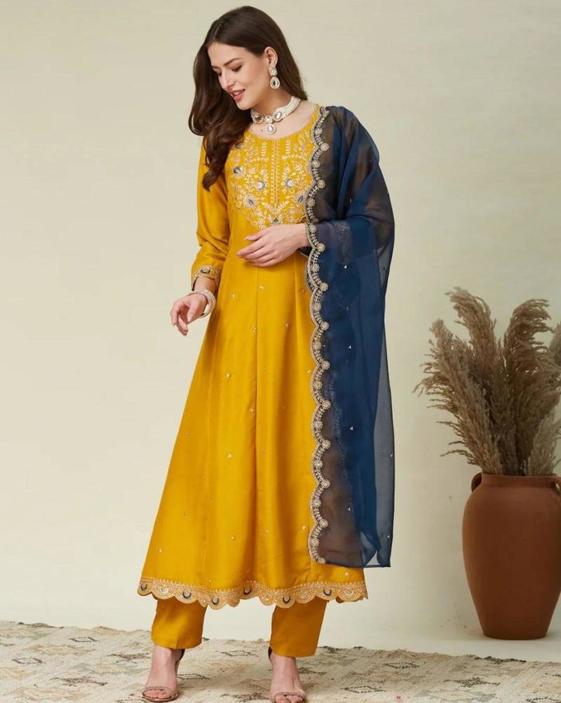 Add vibrancy to your wardrobe with this yellow kurta set paired with a contrasting teal-blue dupatta. Featuring elegant prints and a flattering fit, it offers both comfort and style. Ideal for festive occasions, daytime events, and traditional gatherings, this outfit brings a fresh and lively ethnic appeal.