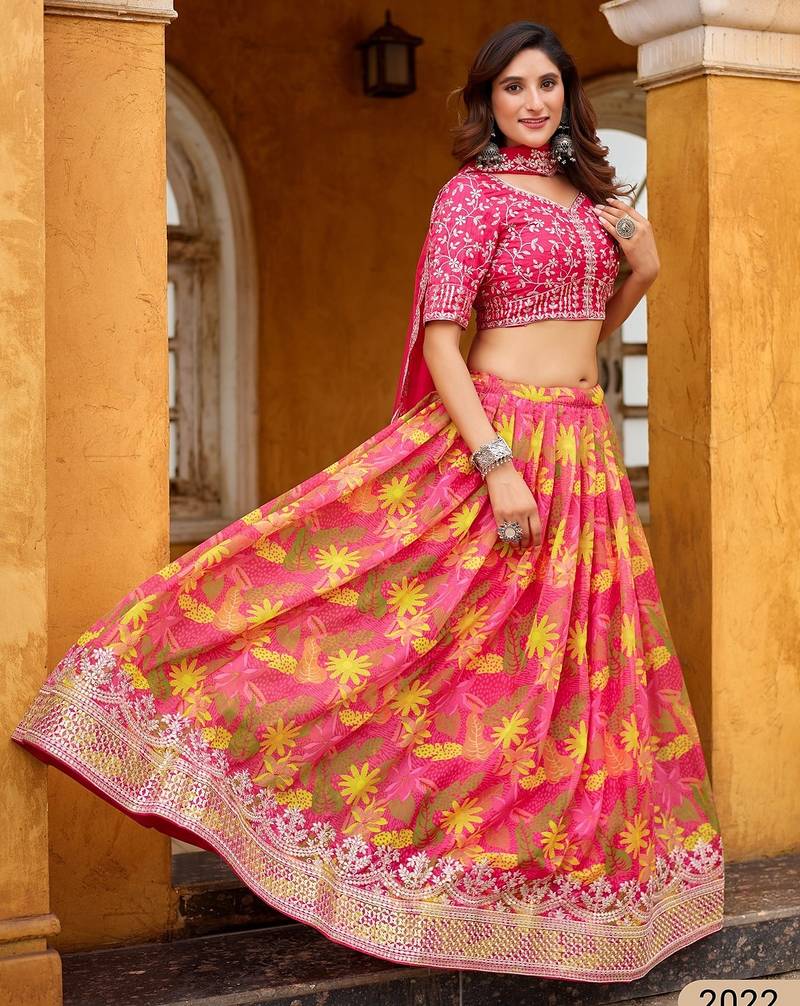 Pink Art Silk Floral Print Semi Stitched Lehenga Choli Size Up To 42