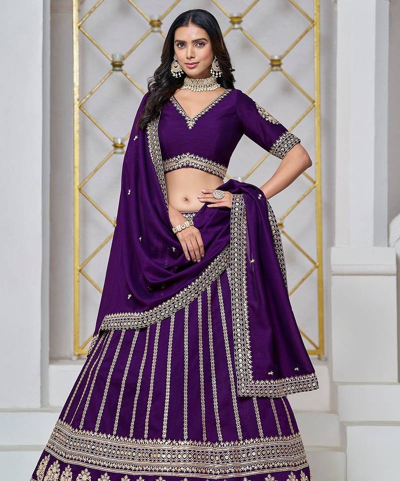 Violet Net Embroidered Semi Stitched Lehenga Choli Size Up To 42