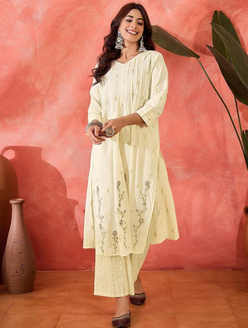 • Product Id : 4759413 • Package Details : 1 Top/ 1 Bottom • Type : Kurta Sets • Occasion : Casual • Fabric : Cotton • Work : Embroidered • Type : Thread Work • Look : Traditional • Sleeve : Quarter Sleeve • Neck Style : V Neck • Color : Off White • Stitching : Stitched • Length : 46.0 General - Color and Texture may have slight variation. This happens because of photography.