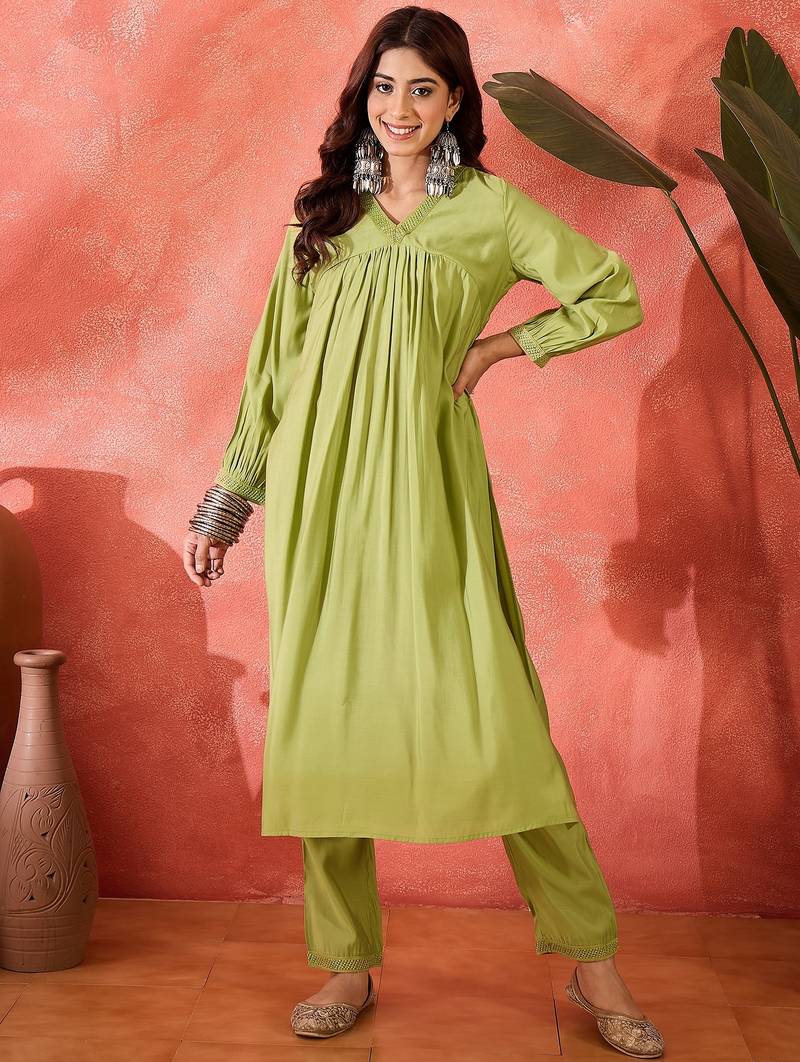 • Product Id : 4759419 • Package Details : 1 Top/ 1 Bottom • Type : Kurta Sets • Occasion : Casual • Fabric : Viscose Rayon • Work : Printed • Type : Screen Print • Look : Traditional • Sleeve : Quarter Sleeve • Neck Style : V Neck • Color : Green • Stitching : Stitched • Length : 46.0 General - Color and Texture may have slight variation. This happens because of photography.
