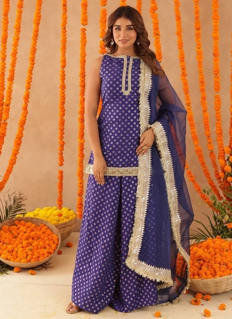 Saba Blue Short Detailed Kurti Palazzo Set Stitched