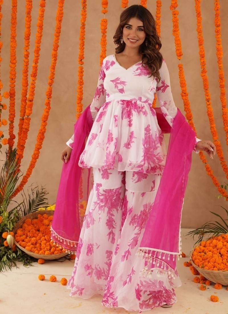 Trisha White Pink Floral Sharara Set Stitched