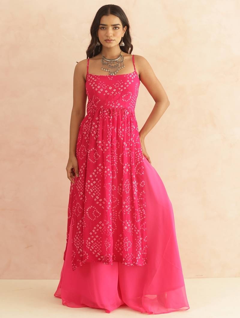 • Product Id : 4713389 • Package Details : 1 Top /1 Bottom • Type : Readymade Suits For Women • Sleeve : Sleeveless • Fabric : Georgette • Color : Pink • Work : Bandhej • Stitching : Stitched Payments [+]