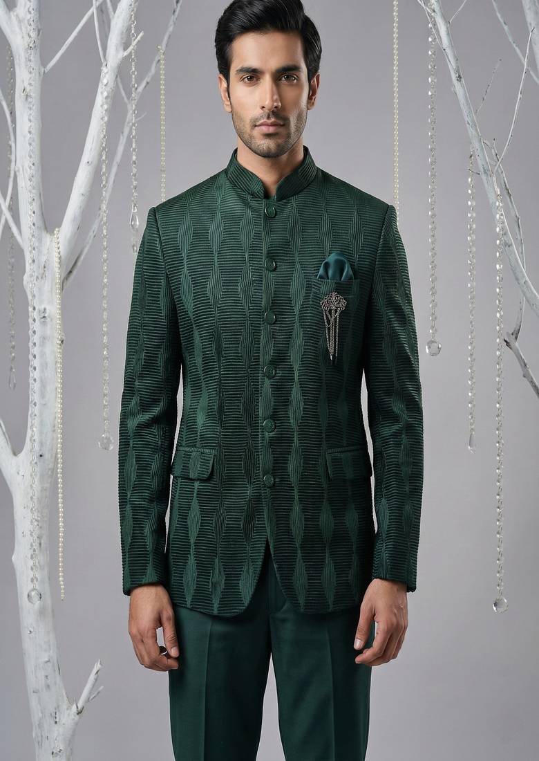 Bottle Green Thread Embroidered Bandhgala