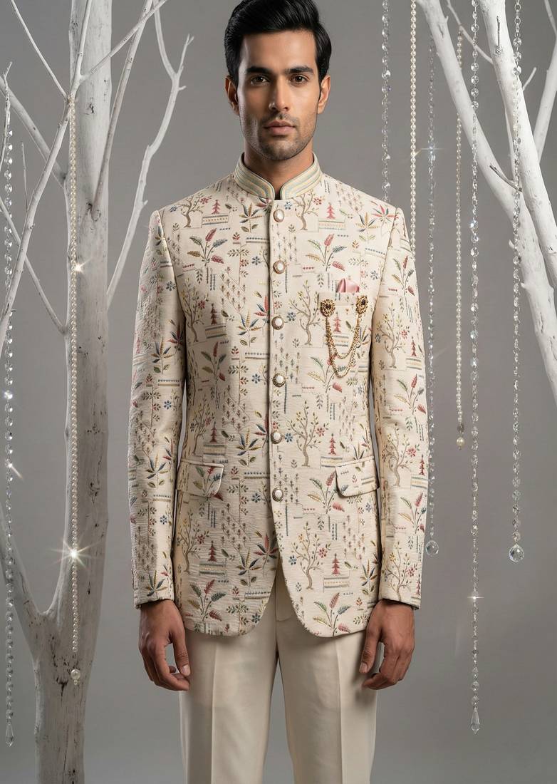 • Product Id : 4707265 • Package Details : 1 Coat : 1 Trouser • Type : Bandhgala Suit • Work : Embroidered • Type : Resham Embroidery • Look : Fashion • Bottom Style : Trouser • Sleeve : Full Sleeve • Bottom Color : Cream • Color : Cream • Top Color : White • Top Fabric : Silk Blend • Fabric : Silk Blend • Stitching : Stitched Payments [+]