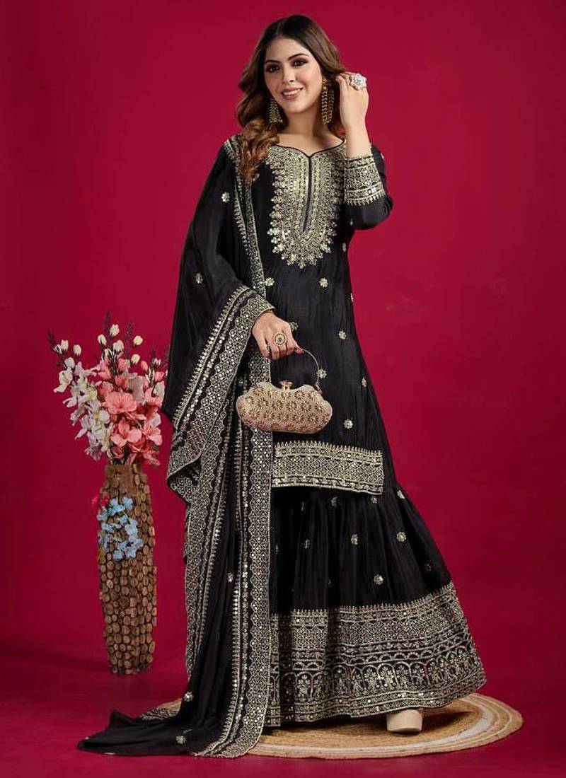 Black Color Heavy Sequins Work Chinon Fabric Wedding Wear Sharara Dress