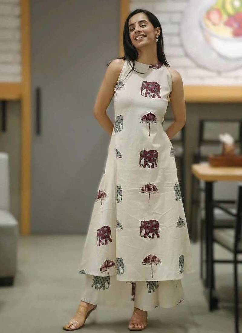 • Product Id : 4703405 • Package Details : 1 Top/1 Pant • Type : Kurtis • Occasion : Casual • Fabric : Cotton • Work : Printed • Look : Fashion • Sleeve : Sleeveless • Color : Off White • Stitching : Stitched • Neck Style : Mandarin Collar Payments [+]