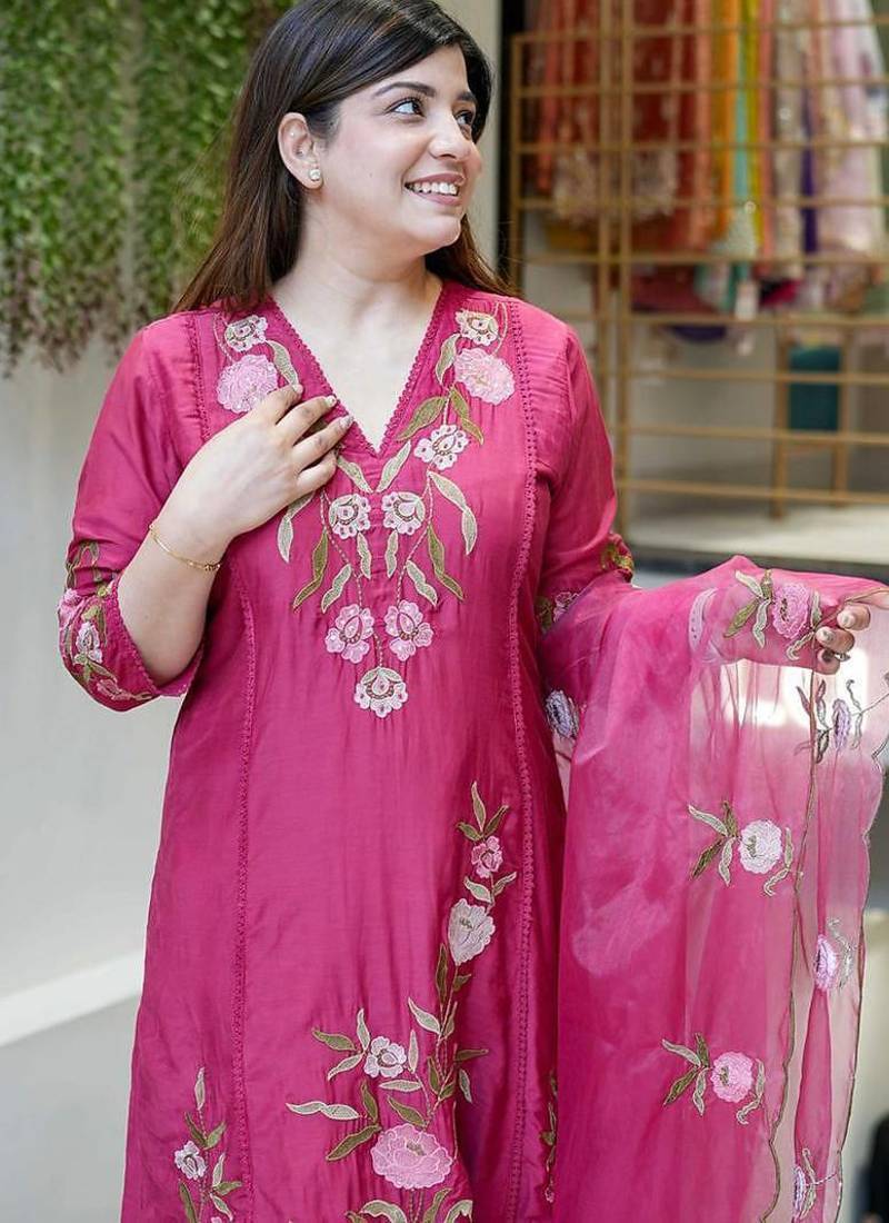 Rani Pink Chanderi Silk Heavy Thread Embroidery Work Kurta Pant Set