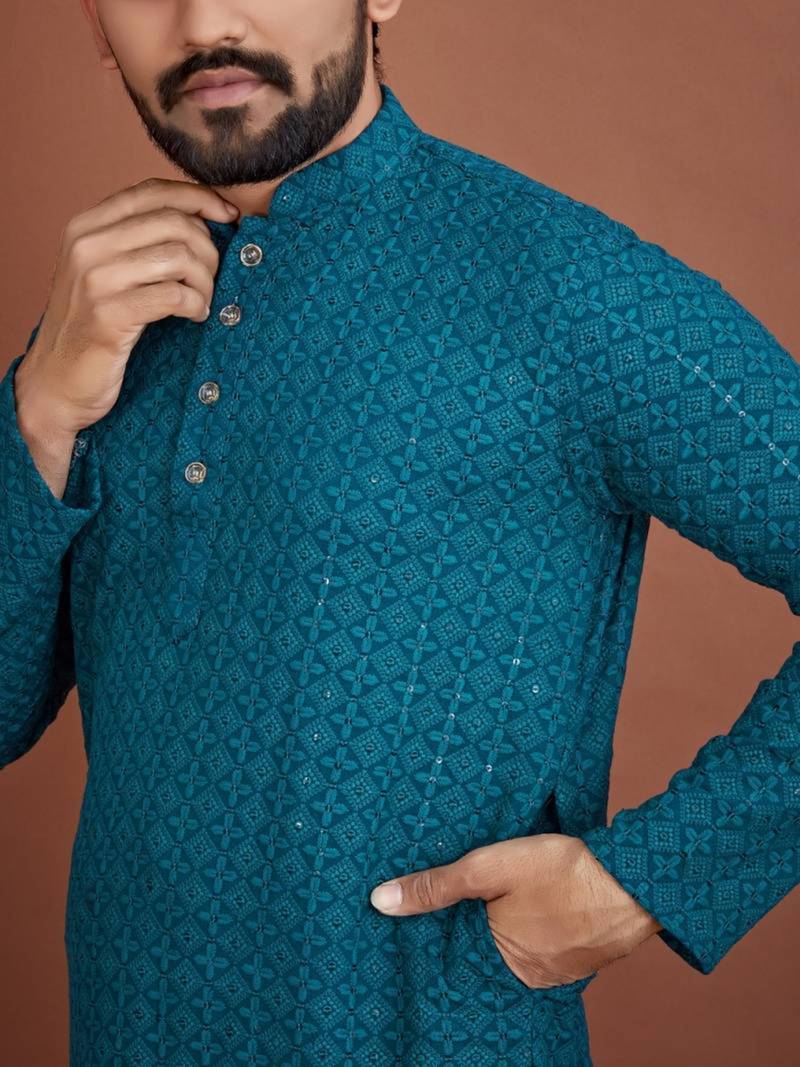 This Men's Embroidered Ethnicwear Showcases Meticulously Tailored Chikankari Embroidery Adding Depth And Charisma To Your Look. The Mandarin Collar Elevates The Ethnicwear's Appeal, Infusing It With A Touch Of Regal Elegance. The Straight Hem With Side Slits Not Only Enhances Movement But Also Creates A Stylish And Dynamic Silhouette. Two Well Placed Pockets Fuse Practicality With Style, Allowing You To Carry Essentials Effortlessly.