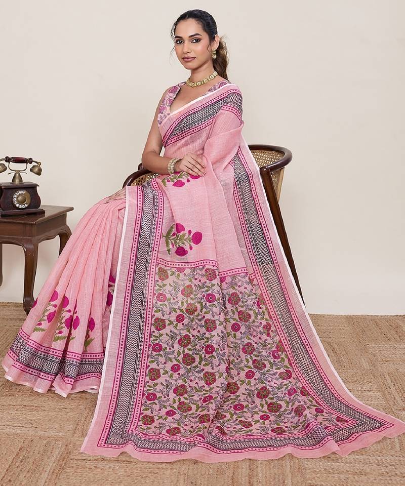 Pink Printed Linen Designer Saree With Blouse