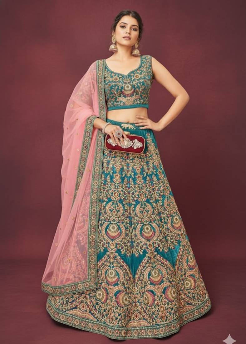 Teal Blue Velvet Thread Zari Dori & Sequins Embroidery Work Wedding Festival Party Wear Designer Lehenga Choli