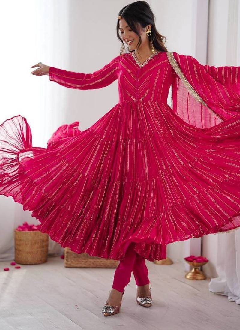 Women Ethnic Wear Ruffle Gown Mal Chanderi Real Mirror With Handwork Kurta Set Stitched