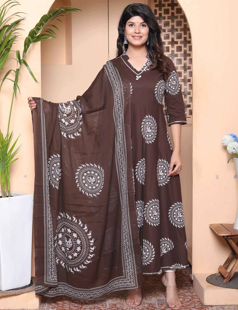 This Brown Animal printed cotton Anarkali Kurta With Dupatta features a fully flared anarkali ornamented with unique print, Pocket on sides & V-Neck Three quarter sleeve, and a Pure Cotton fabric Floral printed dupatta.