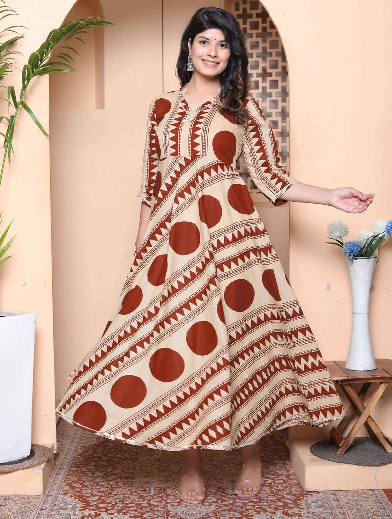Doriyaan Womens Brown Printed V Neck Anarkali Kurta