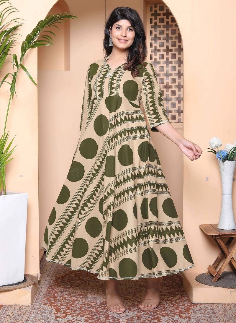 Doriyaan Womens Green Cotton Anarkali Kurta