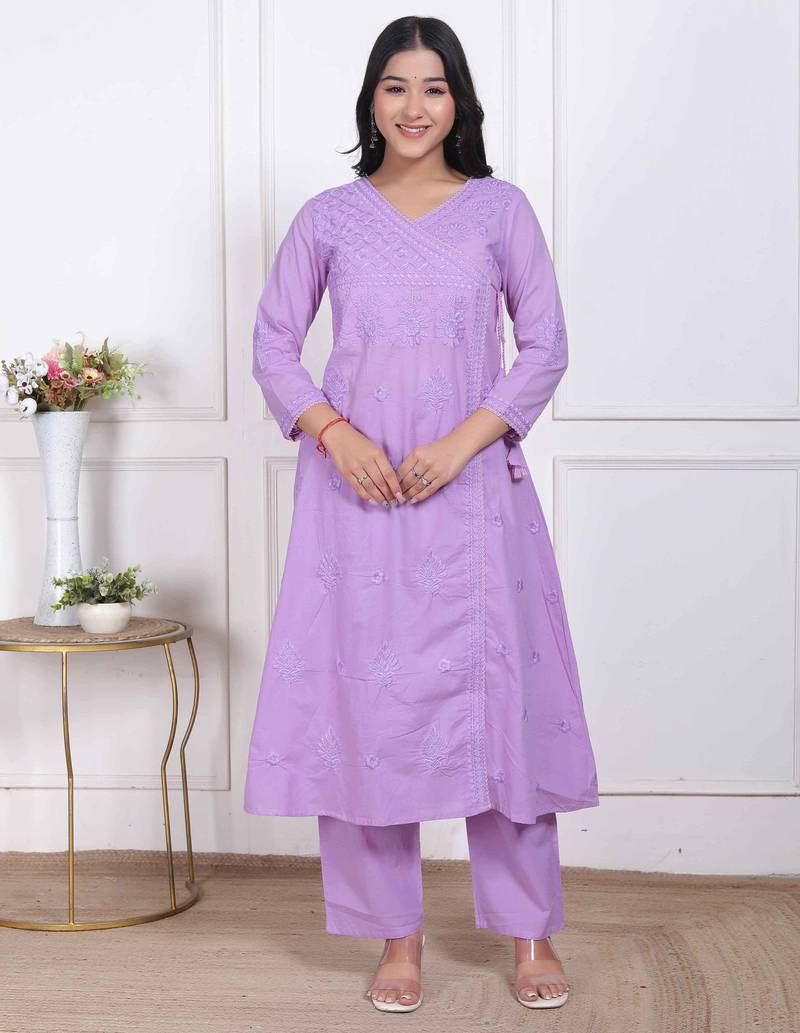 • Product Id : 4713629 • Package Details : 1 Kurta/1 Palazzo • Type : Kurta Sets • Region : India • Occasion : Wedding • Look : Fashion • Sleeve : Quarter Sleeve • Neck Style : V Neck • Fabric : Cotton • Color : Lavender • Work : Chikankari • Stitching : Stitched Payments [+]