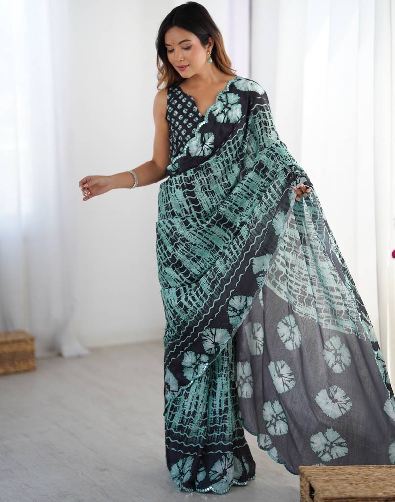 Chiffon Digital Print Scallped Border Foil Mirror Work Saree