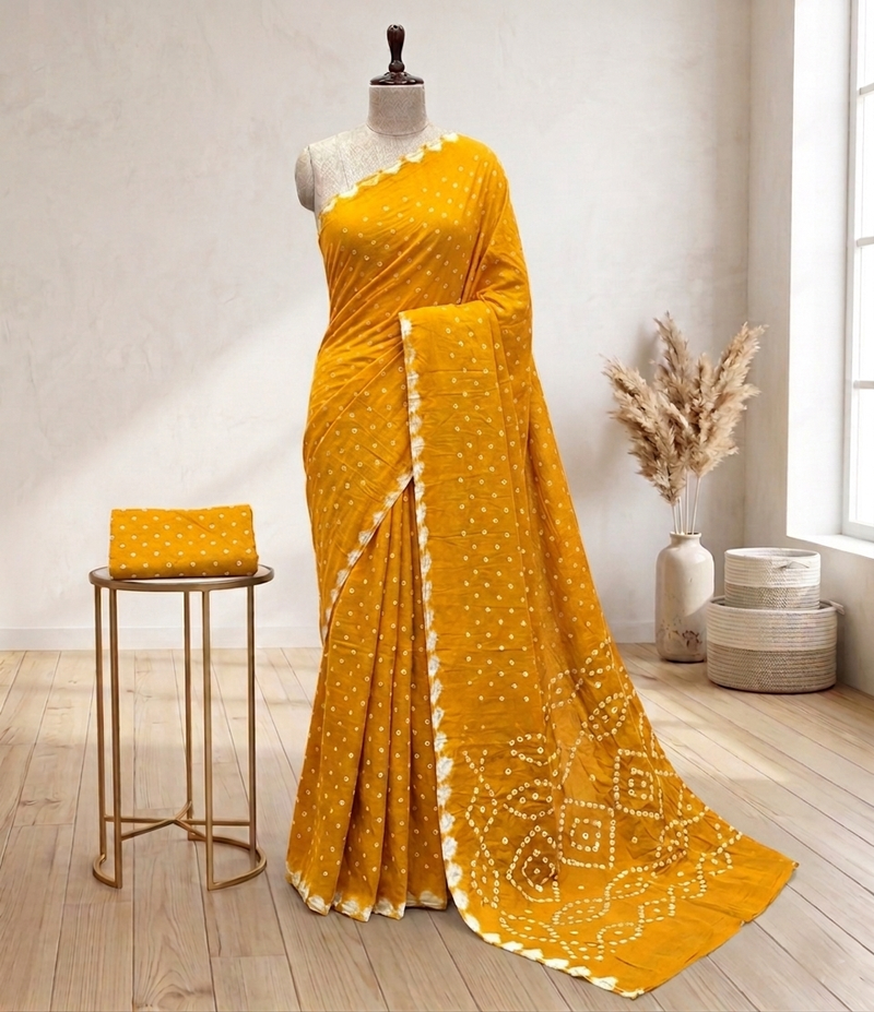 • Product Id : 4751850 • Package Details : 1 Saree/1 Blouse • Type : Bandhani Bandhej Sarees • Occasion : Casual • Work : Printed • Type : Bandhej • Look : Traditional • Pallu Style : Printed Pallu • Stitching : Unstitched • Width : 44 Inches • Length : 5.5 Metres - 5-8 business days in addition to order delivery time.This service is provided to customers outside India only.